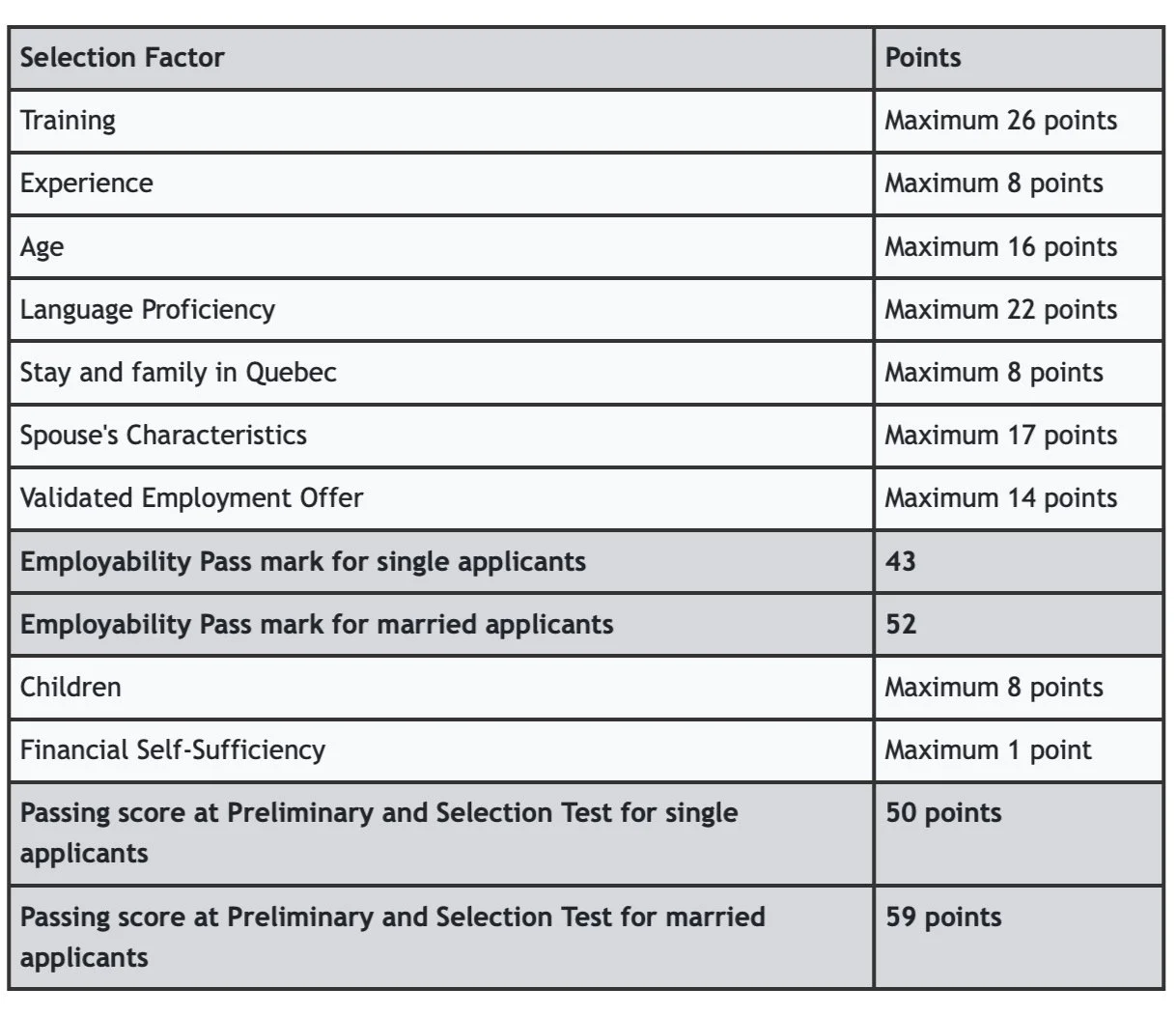 To qualify for a Quebec Selection Certificate, Skilled Worker / Professional applicants must score enough points under the Quebec Immigration selection system below. A single applicant must score at least 50 points based on the criteria below. An applicant with a spouse or common-law/conjugal partner must score at least 59 points.